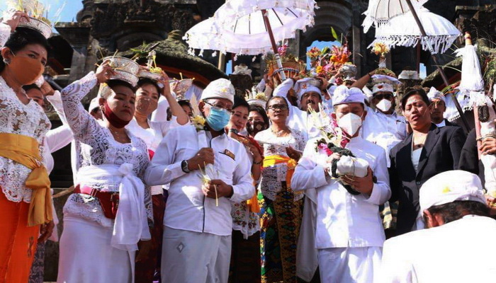 Suwirta didampingi Ny. Ayu Suwirta dan Wakil Bupati Klungkung I Made Kasta beserta Ny. Sri Kasta menghadiri dan turut mengikuti upacara Penyineban Karya Aci Pengenteg Jagat di Pura Gelap, Desa Besakih, Kecamatan Rendang, Karangasem, Kamis, (6/8/2020).