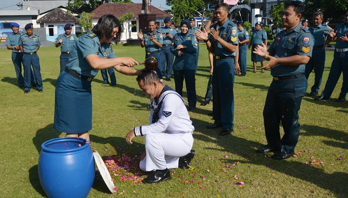 DENPASAR– Siram kembang mewarnai prosesi kenaikan pangkat prajurit Lanal Denpasar di Markas Komando (Mako) Lanal Denpasar Jalan Raya Sesetan 331 Denpasar Bali, Senin (9/4/2018).