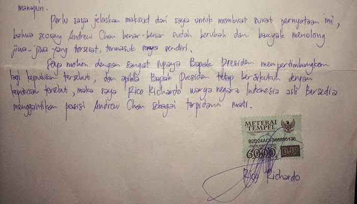 ” Apabila Bapak Presiden Jokowi bersikeras dengan keputusan itu, Saya Rico Rchardo wNI asli bersedia menggantikan posisi Andrew Chan sebagai terpidana mati,” imbuhnya dalam tulisan bermeterai 6 ribu.