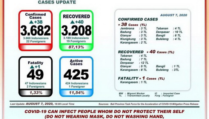 Ketua Harian Gugus Tugas Percepatan Penanganan (GTPP) Covid-19 Provinsi Bali, Dewa Made Indra mengatakan, adanya penambahan pasien baru sebanyak 38 orang dari transmisi lokal.