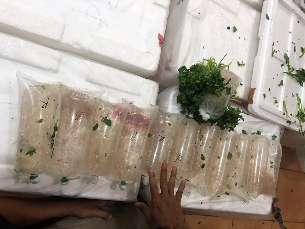 | Pelaku memakai invoice sayuran, ada yang 40 koli berisi ubi dan buncis. Packing menggunakan box sterofoam/Dok. Humas KKP. |
