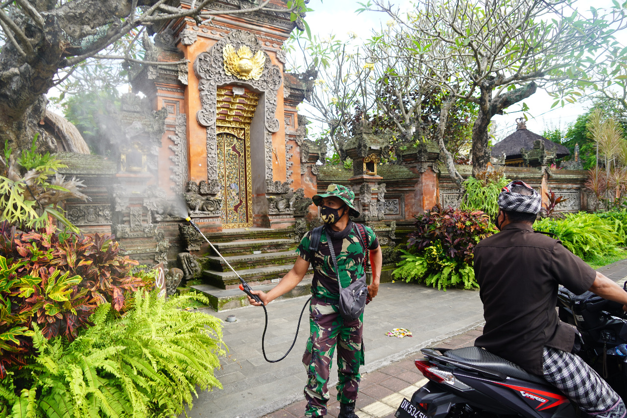| Korem 163/Wira Satya dan Polres Gianyar, Komunitas Eco Enzim Nusantara, Palang Merah Indonesia (PMI) Gianyar melaksanakan penyemprotan eco enzyme di Desa Peliatan, Ubud, Gianyar/Dok.PenramIX/Udayana |