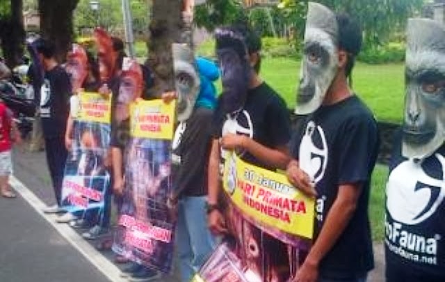 Sembari mengenakan topeng primata mereka menyampaikan ajakan untuk memperhatikan nasib primata di Indonesia.