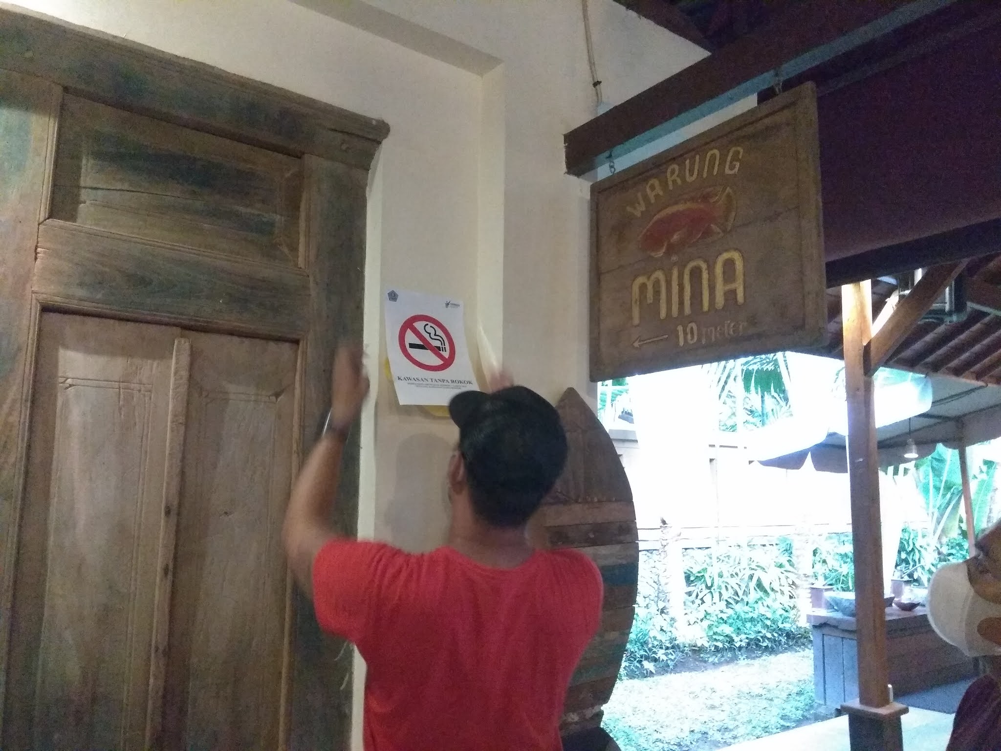 mamasang stiker larangan merokok di beberapa tempat startegis di ruang utama