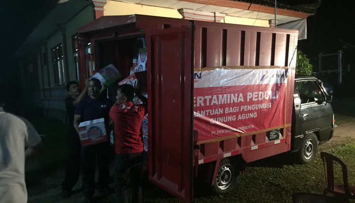 KARANGASEM – Pertamina Marketing Operation Region V (MOR V) JatimBaliNus melalui Pertamina Peduli menyalurkan sejumlah bantuan kepada para pengungsi di sejumlah tempat bagi warga pengungsi Gunung Agung Kabupaten Karangasem