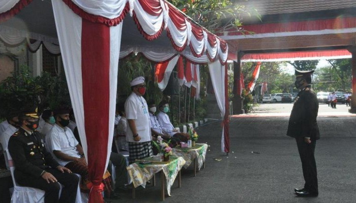 Upacara diselenggarakan sekitar pukul 16.00 wita, selain Inspektur Upacara, Aubade dan Pengibar Bendera Merah Putih serta Forkopimda, peserta menggunakaan pakaian adat Bali.