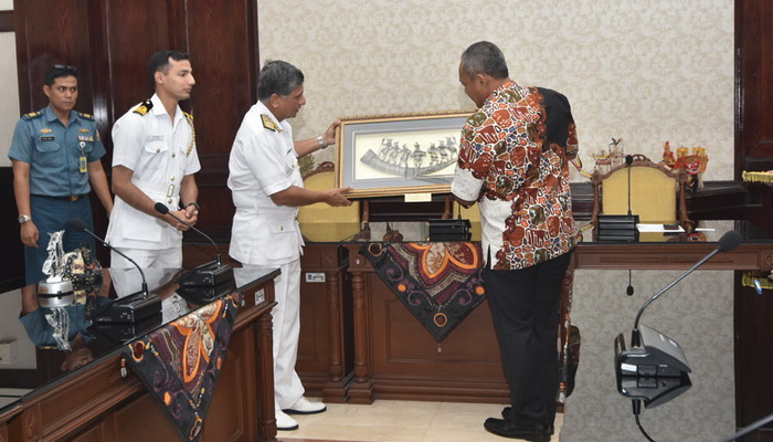 SURABAYA – Setelah sandar di pelabuhan Jamrut Utara pelabuhan Tanjung Perak Surabaya, Flag Officer Commanding Eastern Fleet Rear Admiral Biswajit Dasgupta, YSM, VSM dan Fleet Operations Officer, Eastern Fleet Commodore TVN Prasanna beserta ke-empat komandan kapal perang India melaksanakan kunjungn kehormatan ke kantor Walikota Surabaya, Jum’at (2/6/17)