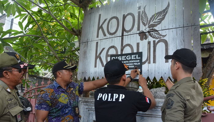 DENPASAR – Warung Kopi Kebun di Jalan Tukad Melangit Panjer Denpasar disegel petugas Satpol PP Kota Denpasar bersama Tim Yustisi Kota Denpasar lantaran terbukti tidak mengantongi izin usaha.