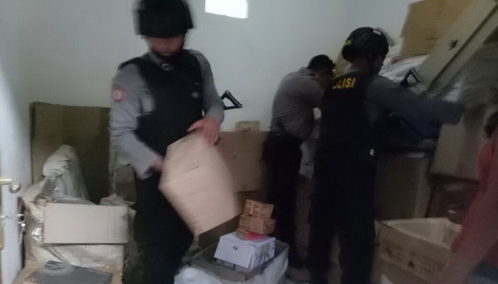 | Petugas kepolisian dari Polres Tabanan saat melakukan penggeledahan barang bukti rokok illegal |
