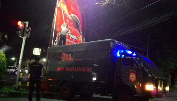 Usai penurunan baliho dengan menggunakan bantuan truk, aparat kemudian menuju perempatan Gerogak di Jalam By Pass Dr. Soekarno untuk kembali menurunkan baliho sejenis yang dipasang sebuah ormas. (gus)