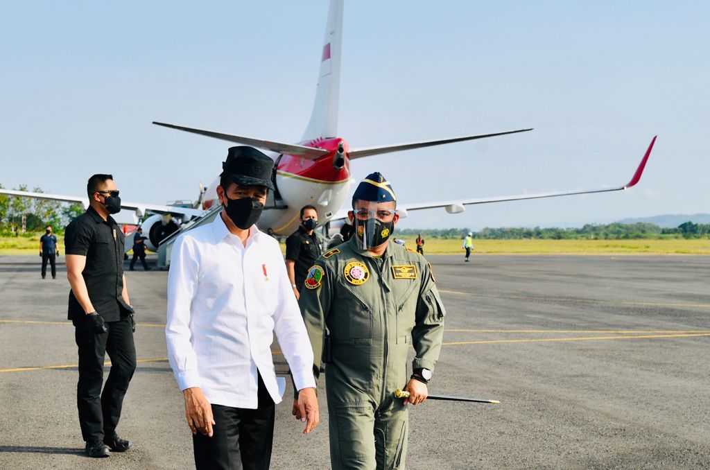 Usai lawatan di Kabupaten Madiun, Kamis, 19 Agustus 2021, Presiden Joko Widodo bertemu para penerbang Garuda Flight dan Nusantara Flight di Pangkalan TNI AU Iswahjudi, Kabupaten Magetan.