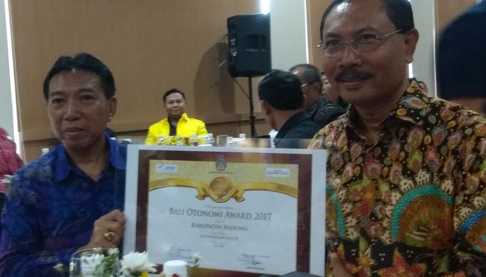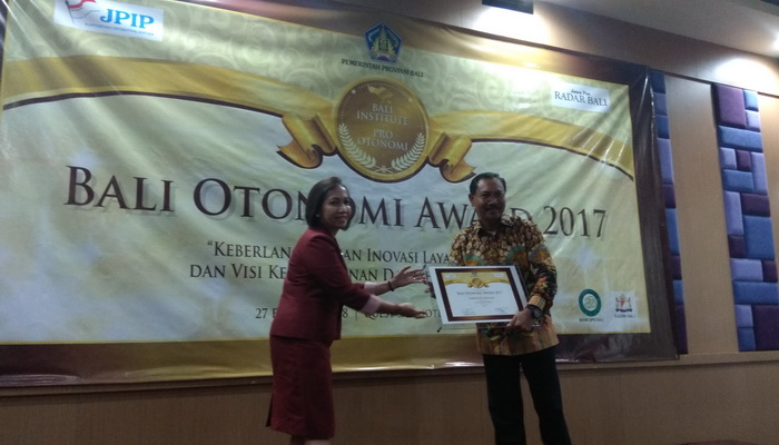 | Kepala DKLH Kabupaten Badung Putu Eka Merthawan saat menerima Bali Otonomi Award 2017 |