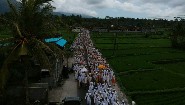 KARANGASEM – Upacara nunas don bringin (mengambil daun bringin) di Pura Bangkak Kaler, Desa Adat Sibetan, Bebandem, Karangasem dihadiri ribuan warga pasemetonan Arya Kanuruhan dihadiri, Rabu (5/9/2018).