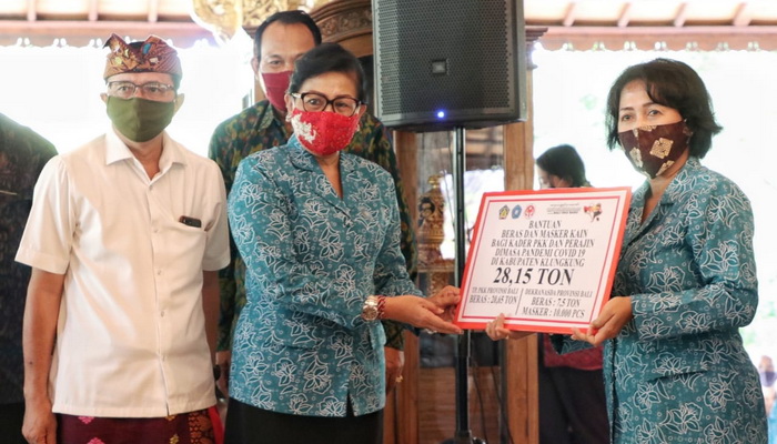 Denpasar – Ketua TP PKK Provinsi Bali Ny Putri Suastini Koster yang juga Ketua Dekranasda Provinsi Bali menyerahkan bantuan beras sebanyak 410,9 ton dan 90.000 pcs masker kain kepada masyarakat terdampak pandemi Covid-19.