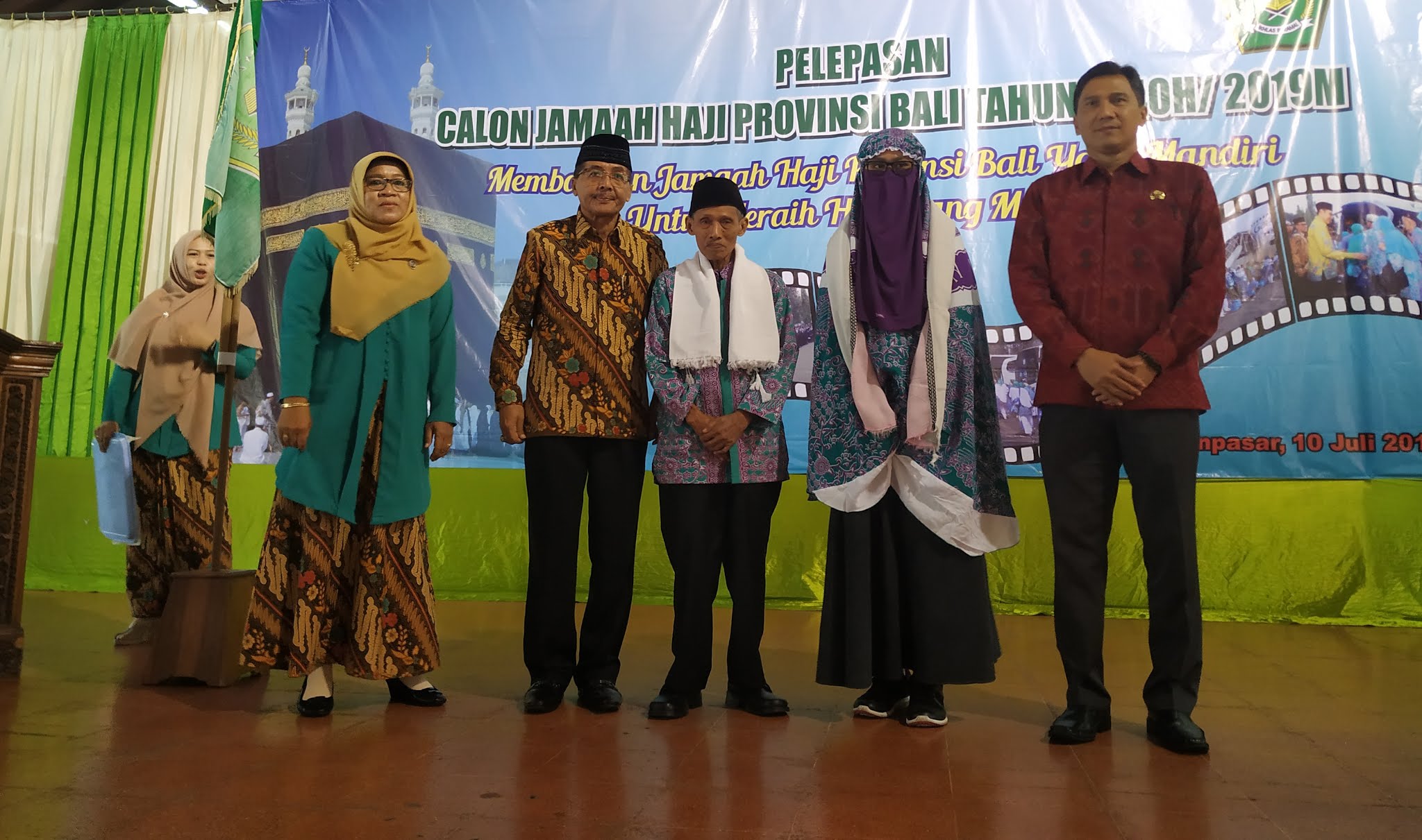Mewakili Gubernur Bali I Wayan Koster, Kepala Biro Kesra Ketut Sukra Negara dan Kepala Kantor Kemenag Wilayah Bali, I Nyoman Lastra, resmi melepas rombongan haji yang terbagi dalam tiga kloter yang berjumlah 1.054 orang.