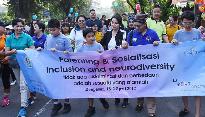 Mengangkat tema “Inclusion And Neurodiversity”, tidak ada diskriminasi dan perbedaan adalah sesuatu yang alamiah, digelar jalan santai yang dilepas Ketua Koordinator Kegiatan Kesejahteraan Sosial (K3S) Denpasar Ny. I.A Selly Dharmawijaya Mantra di depan PLA Denpasar Jalan Mataram Nomor 3 Denpasar, Minggu (2/4/17).