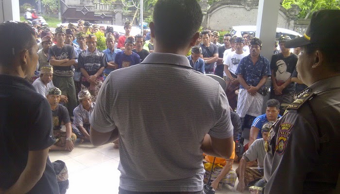 Kedatangan warga yang berpakaian adat madya dipimpin Dewa Gede Adi Putra (33), menanyakan proses penanganan kasus pengreyokan terhadap Putu Agus Swastika (30).
