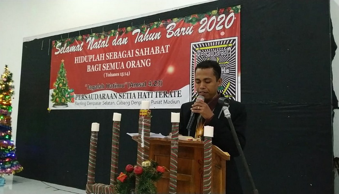 | Pendeta Daud Banamtuan saat memberikan pesan-pesan perayaan Natal PSHT Ranting Denpasar Selatan |