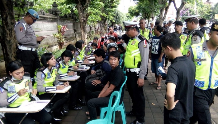DENPASAR– Puluhan pengendara motor terjaring razia gabungan Direktorat Lalu Lintas Polda Bali di Jalan Cokroaminoto, Minggu (4/11/2018).
