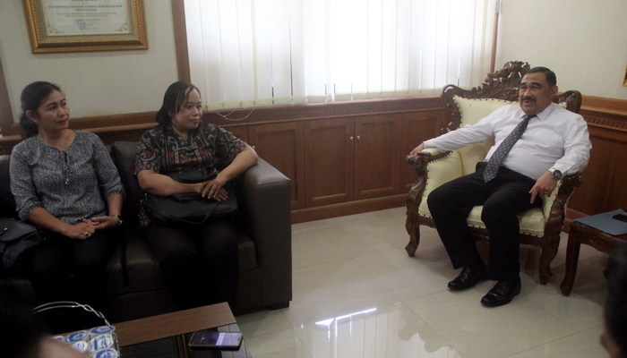 | AA Sagung Mas Prihantini (tengah), stri almarhum jurnalis Radar Bali yang dibunuh AA Gde Bagus Narendra Prabangsa saat bertemu Kepala Kanwil Kementerian Hukum dan HAM Bali Sutrisno |