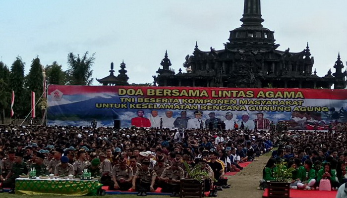 Kegiatan yang diinisiasi TNI bersama sejumlah elemen lintas agama melakukan gelar doa bersama menyusul status Awas Gunung Agung. Saat ini, masyarakat diliputi rasa was-was sejak Jumat pekan lalu ditetapkan awas, pemantauan intens terus dilakukan pihak PVMBG (Pusat Vulkanologi dan Mitigasi Bencana Geologi).