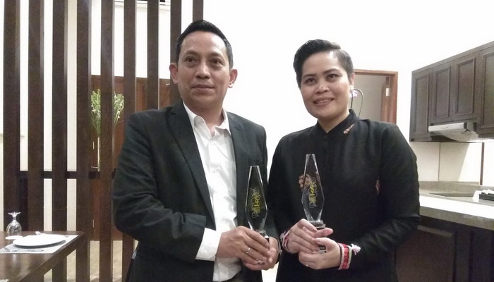 | General Manager Royal Tulip Springhill Resort Rizal H Sulthoni dan Resort Manager Ni Made Yuliantini menujukkan dua penghargaan yang diraih luxury hotels di Jimbaran, Badung |