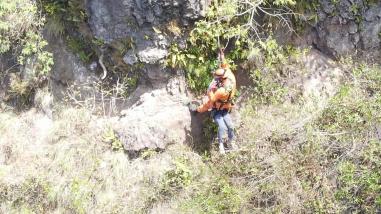 | Satu personil dengan bantuan peralatan mounteneering satu orang rescuer diturunkan dan selanjutnya melaksanakan penarikan satu persatu korban/Dok. Basarnas Bali. |