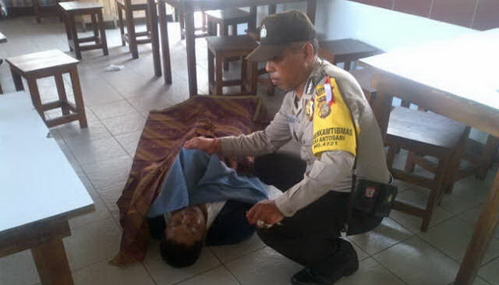 Korban kemudian dibaringkan di lantai warung untuk selanjutnya diberikan pertolongan.