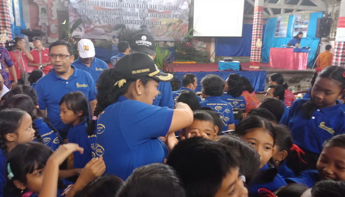 KARANGASEM – Mengajak anak-anak usia dini atau sekolah Bupati Karangasem I Gusti Ayu Mas Sumatri mencanangkan Gemarikan (Gerakan Makan Ikan) di Wantilan Banjar Wates Kangin, Desa Duda Timur Kecamatan Selat, Kamis 9 Agustus 2018.