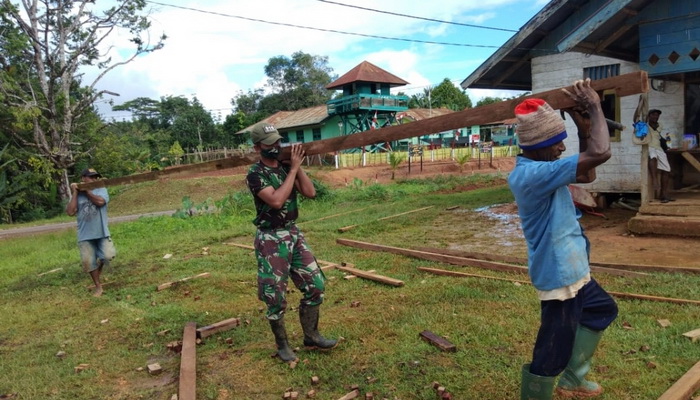 Kegiatan gotong royong membangun rumah adat Papua, Minggu, 2 Agustus 2020, dipimpin Lettu Inf Eko Guruh mendapat respos baik dari masyarakat sekitar/ist. |