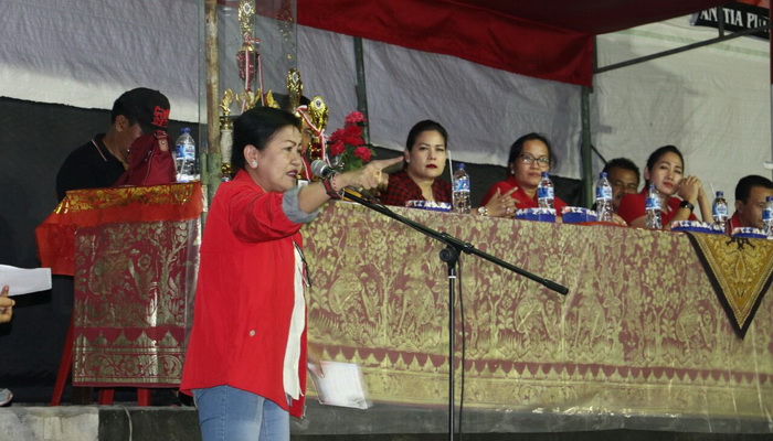 JEMBRANA- Istri calon gubernur Bali Wayan Koster, Ni Putu Putri Suastini menghadiri pembukaan turnamen Bola Volly Putra Alam Cup I di desa Yehembang, Kecamatan Mendoyo, Jembrana, Jumat (4/5/2018) malam.