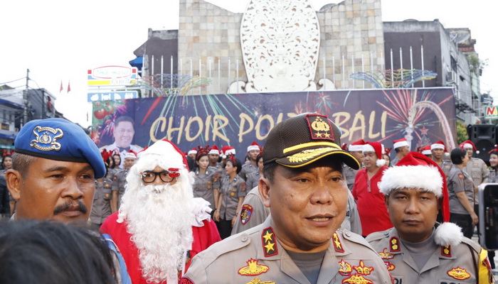 BADUNG – Dalam rangka menyambut Hari Natal Tahun 2018 dan Tahun Baru 2019, paduan suara Polda Bali menghibur masyarakat baik domestik maupun mancanegara di wilayah Kuta Kabupaten Badung.