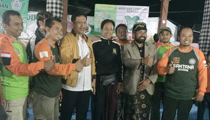 | Seanator asal Bali, Gede Pasek Suardika saat bersama dengan relawan Santana (Santri Tanggap Bencana) di Kintamani |