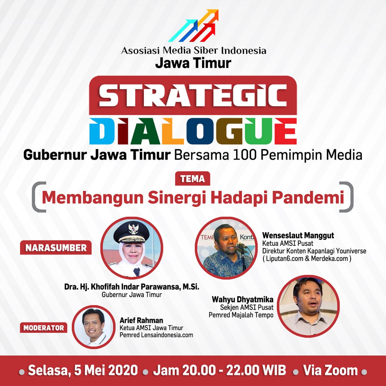 Dialog strategis antara Gubernur Jatim Khofifah Indar Parawansa dengan 100 pemimpin media anggota AMSI se-Indonesia ini mengambil tema “Membangun sinergi hadapi pandemi”.