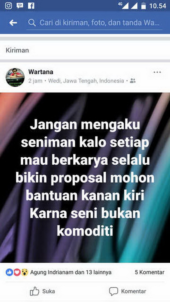 Status yang menyulut reaksi seniman lainnya di media sosial itu berbunyi “Jangan Mengaku Seniman Kalo Setiap Mau Berkarya Selalu Bikin Proposal Mohon Bantuan Kanan Kiri karena Seni Bukan Komoditi”.