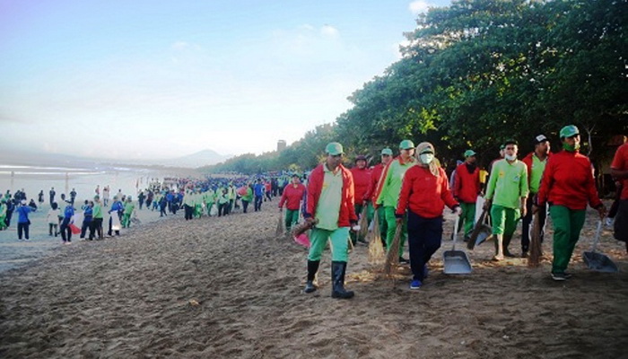 DKLH mengerahkan pegawai berbagai lembaga dan pelajar untuk membersihkan sampah di Pantai Kuta.