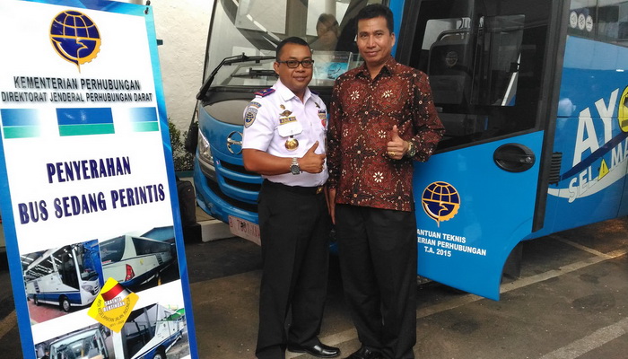 | Kadishubkominfo (kiri) dan Penjabat Bupati Tabanan (kanan) usai penerimaan bantuan bus sedang perintis |