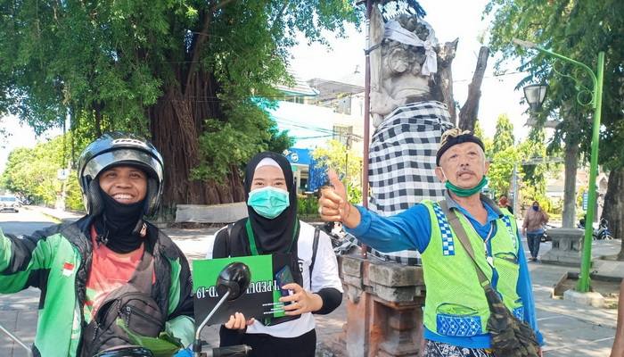 Mereka bergerak di sekitae Lapangan Puputan Badung, seperti, tukang parkir, pengemudi ojek kelilibg Ojol, pecalang yang bertugas mengamankan taman, juga para pedagang asongan yang kebetulan lewat di sekitaran taman, Minggu 19 April 2020.