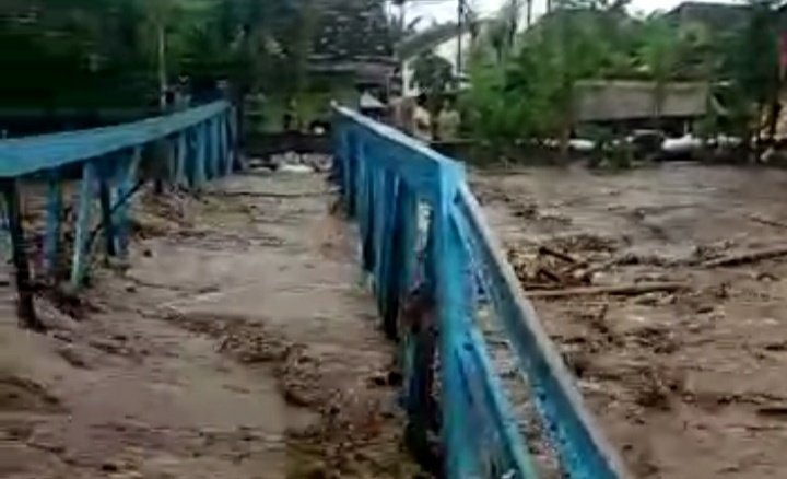 karena tingginya debit air dan tanggul pembatas antara jembatan dan lahan