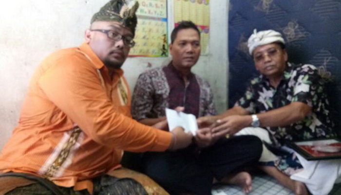 | ZaeeanlArifin (tengah) menerima tali asih yang diserahkan IB Ketut Kiana (Kanan) dan Harry Suanda Putra( kiri) |