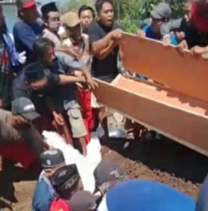 Spontan, ada warga marah dan langsung membuka tutup peti kemudian lainnya ikut membantu dan langsung mengangkat jenazah di dalam peti.