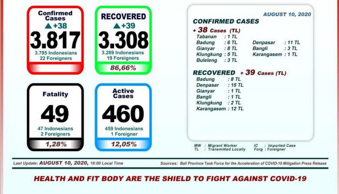 Denpasar – Gugus Tugas Percepatan Penanganan COVID-19 Provinsi Bali menyampaikan perkembangan sampai Senin (10/8) jumlah kumulatif pasien positif 3.817 (bertambah 38 transmisi lokal).