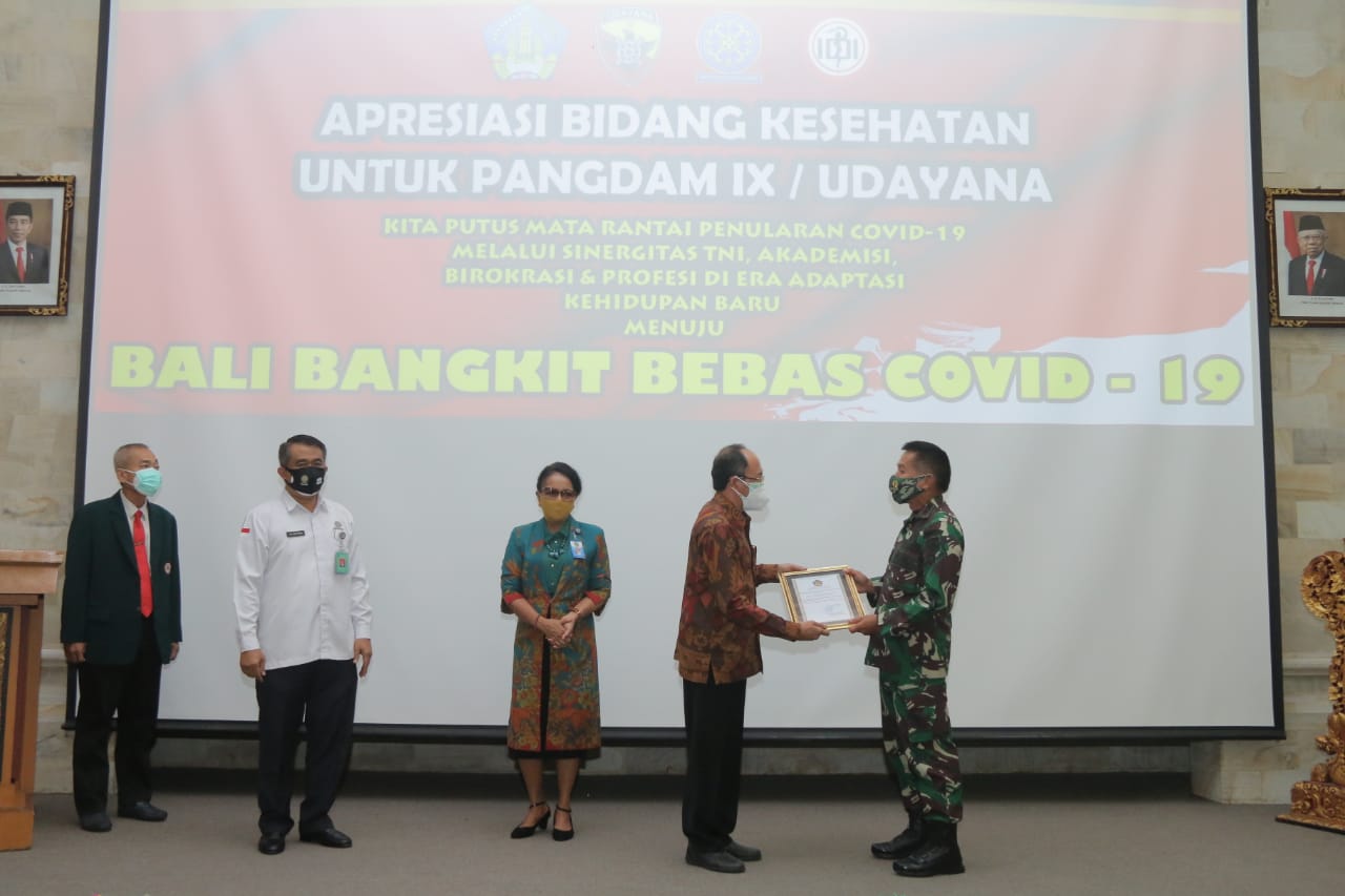 “Saya selaku Pangdam IX/Udayana mewakili seluruh Anggota Kodam IX/Udayana, merasa bangga dan mengucapkan terimakasih yang setinggi-tingginya kepada Rektor Unud khususnya kepada Fakultas Kedokteran Udayana, Ikatan Dokter Indonesia (IDI) Provinsi Bali dan Dinas Kesehatan Provinsi Bali yang telah memberikan Penganugerahan Apresiasi Bidang Kesehatan kepada Kodam IX/Udayana dalam penanggulangan Covid-19 di wilayah Bali,” ucap Pangdam.