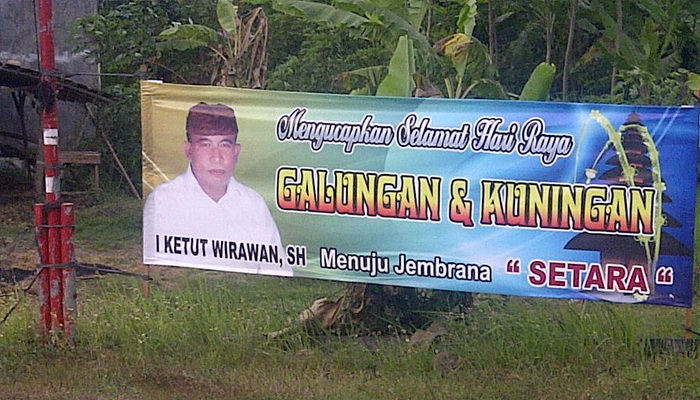 Kabarnusa.com – Bakal calon Bupati Jembrana yang diusung KMP (Demokrat, Gerindra, Golkar) I Ketut Wirawan telah lempar handuk sebelum bertarung hampir sebulan lalu. Namun sejumlah baliho Wirawan berbagai ukuran bertuliskan “SETARA“ masih terpasang di beberapa lokasi di Kabupaten Jembrana.
