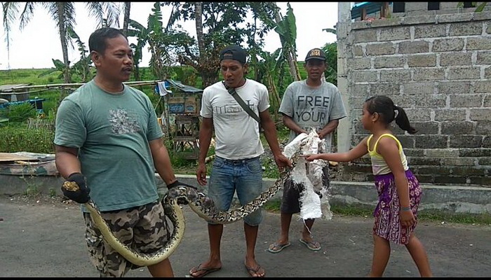 BADUNG – Warga Perumahan Dewata Permai, Sading di Kecamatan Mengwi, Badung dikejutkan dengan kehadiran ular python sepanjang tiga meter usai memangsa ayam piaraan sehingga mereka beramai-ramai menangkap ular tersebut.