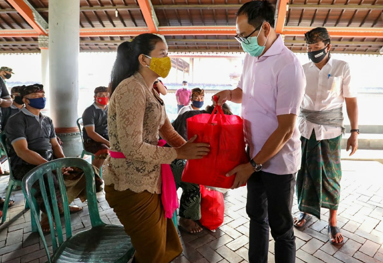 Bertempat di Wantilan Pura Dalem Desa Adat Mengwi, Suiasa mendistribusikan 16 paket bantuan sembako untuk meringankan beban masyarakat yang melakukan isolasi mandiri akibat salah satu anggota keluarganya terpapar virus Corona.
