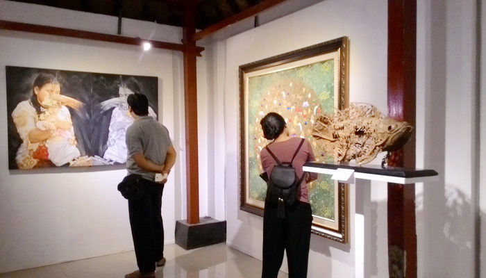 | Dua orang penikmat seni saat mengamati karya lukisan dan patung yang dipamerkan di Puri Anom Tabanan |