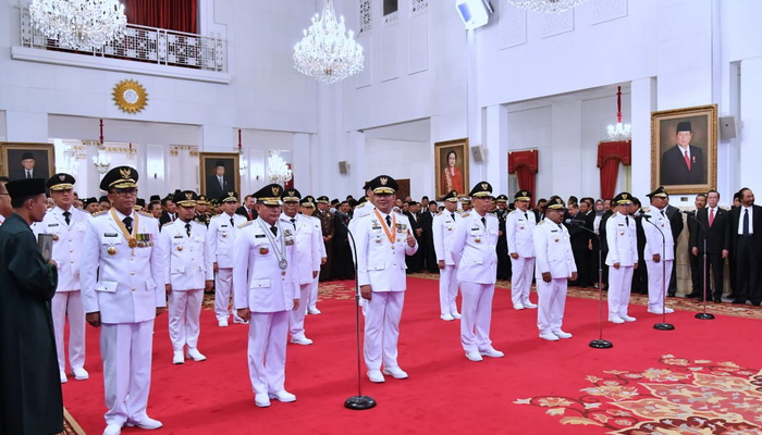 “Saya berjanji akan memenuhi kewajiban saya sebagai gubernur, sebagai wakil gubernur, dengan sebaik-baiknya dan seadil-adilnya, memegang teguh Undang-Undang Dasar Negara Republik Indonesia Tahun 1945, dan menjalankan segala undang-undang dan peraturannya dengan selurus-lurusnya, serta berbakti kepada masyarakat, nusa, dan bangsa,” ucap Presiden diikuti pejabat yang dilantik.