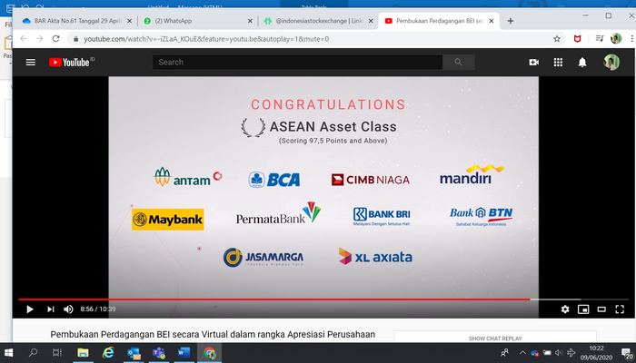 PT Bursa Efek Indonesia (BEI) melakukan pembukaan perdagangan untuk memberikan apresiasi kepada perusahaan-perusahaan yang memenangkan ASEAN Corporate Governance Scorecard (ACGS), Selasa (9/6).